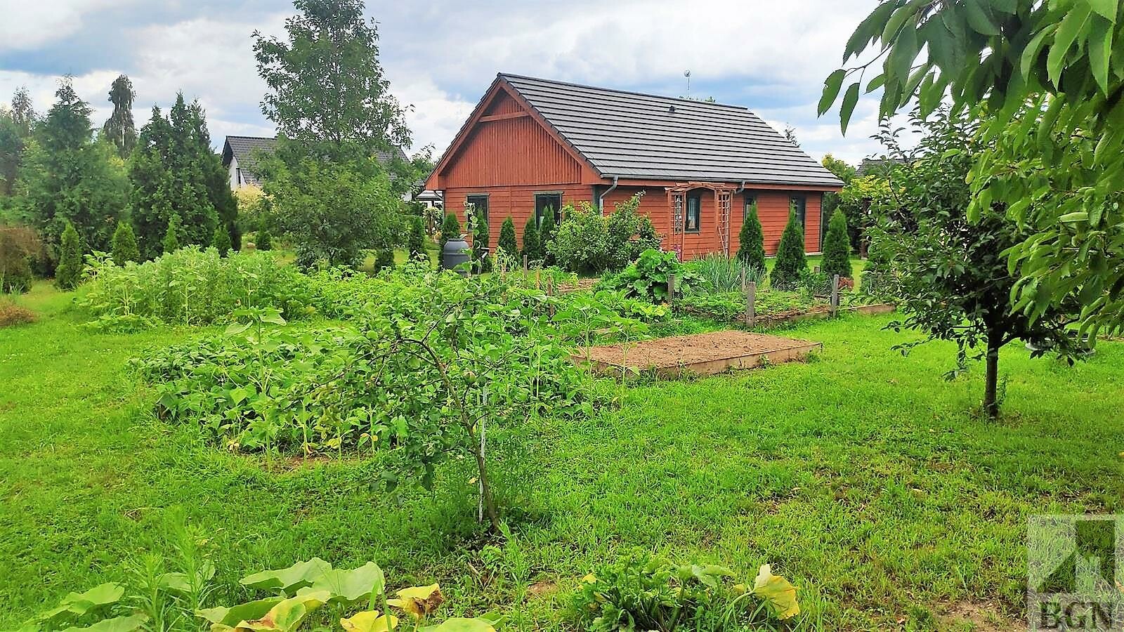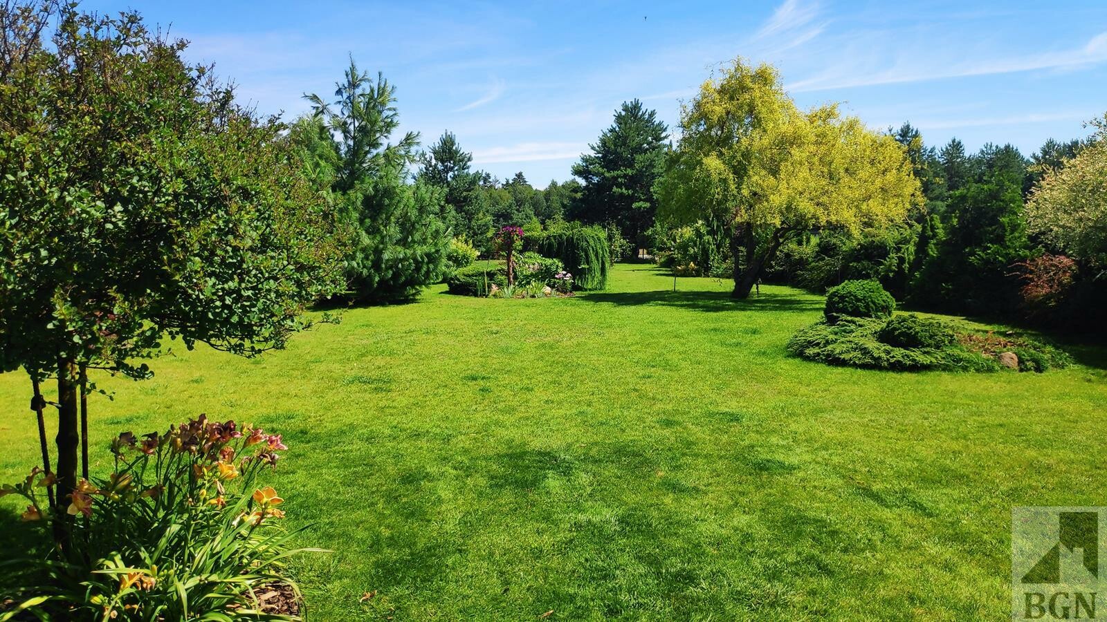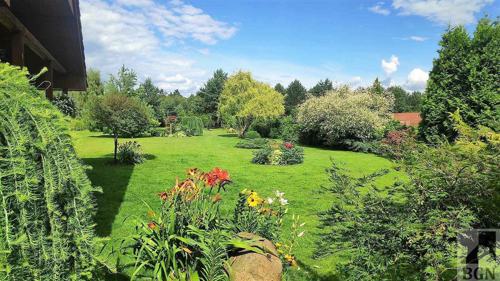 Piękne nasadzenia, drzewka, krzewy, rabaty kwiatowe, oczko wodne, ogródek warzywny.