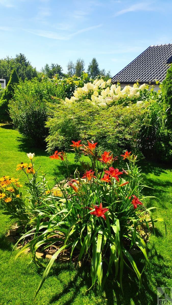 Zadbany ogród z automatycznym systemem podlewania i dozownikiem nawozów oraz czujnikiem deszczu.
