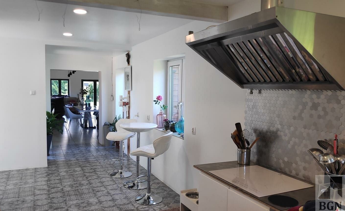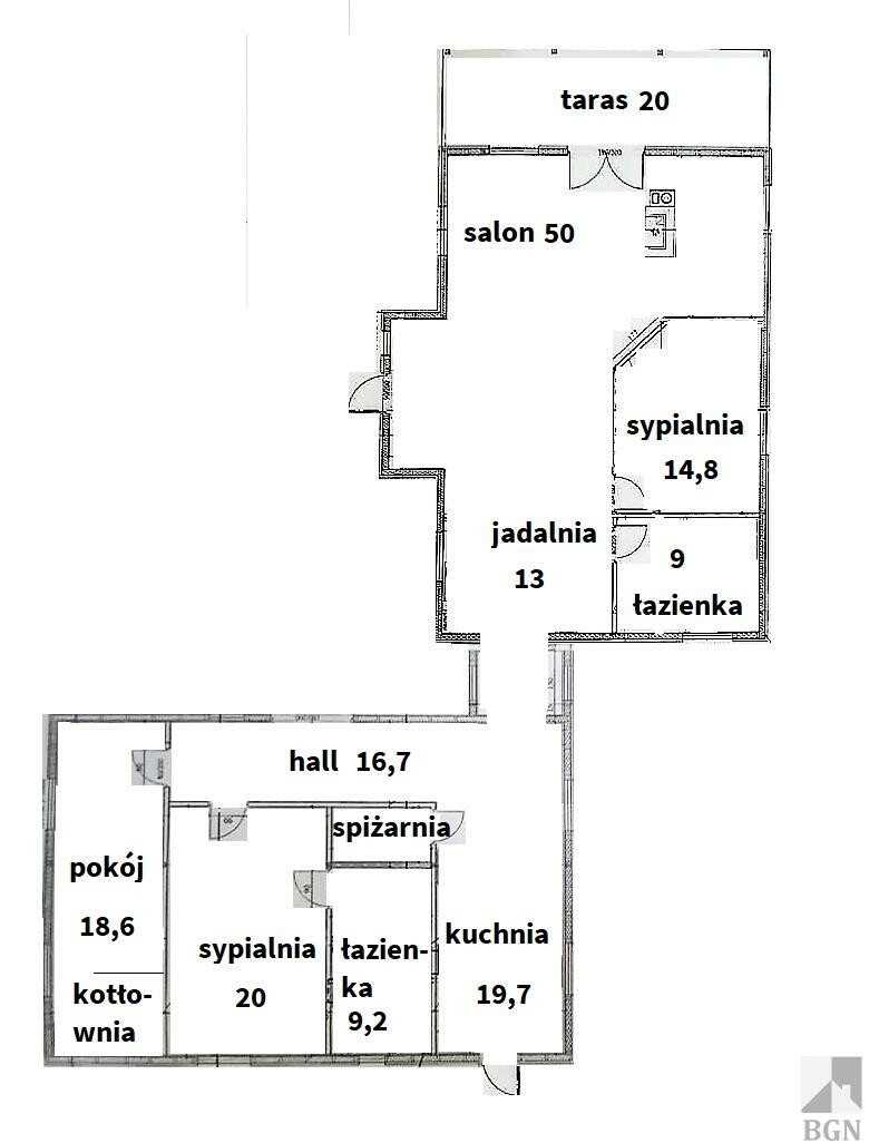 W części prywatnej: kuchnia - 17 mkw, spiżarnia - 2,8 mkw, komunikacja 16,6mkw, pokój 18,6mkw, sypialnia główna - 20 mkw, z wyjściem do pomieszczenie przygotowane pod łazienkę 9,2 mkw.