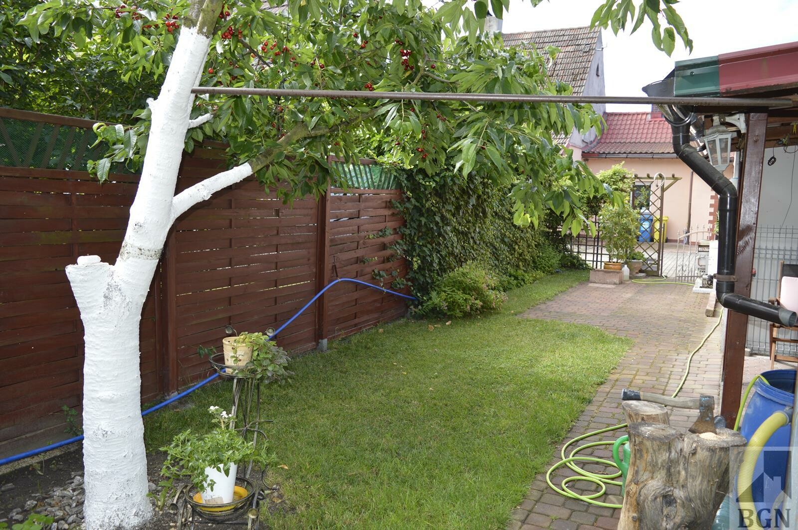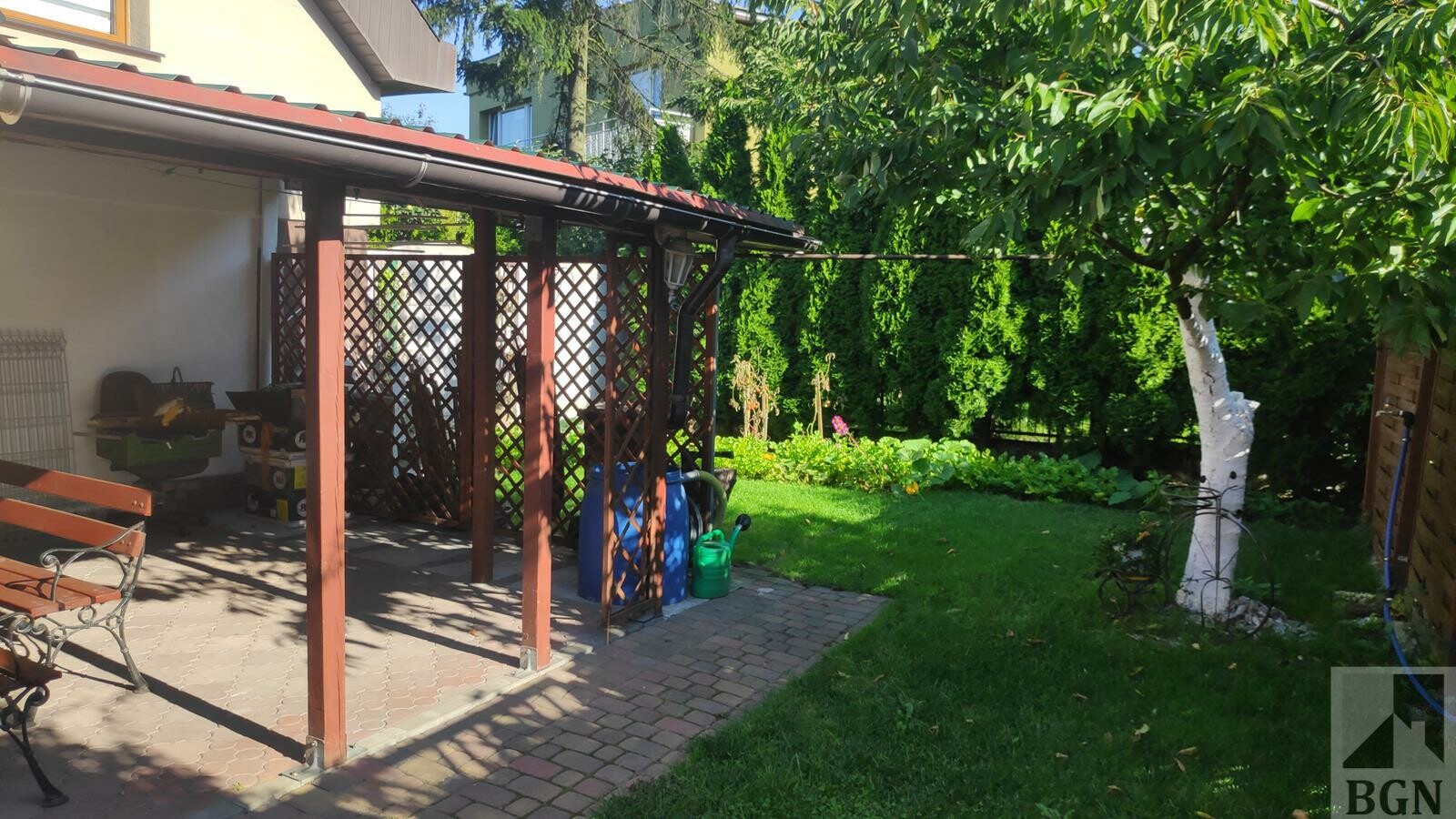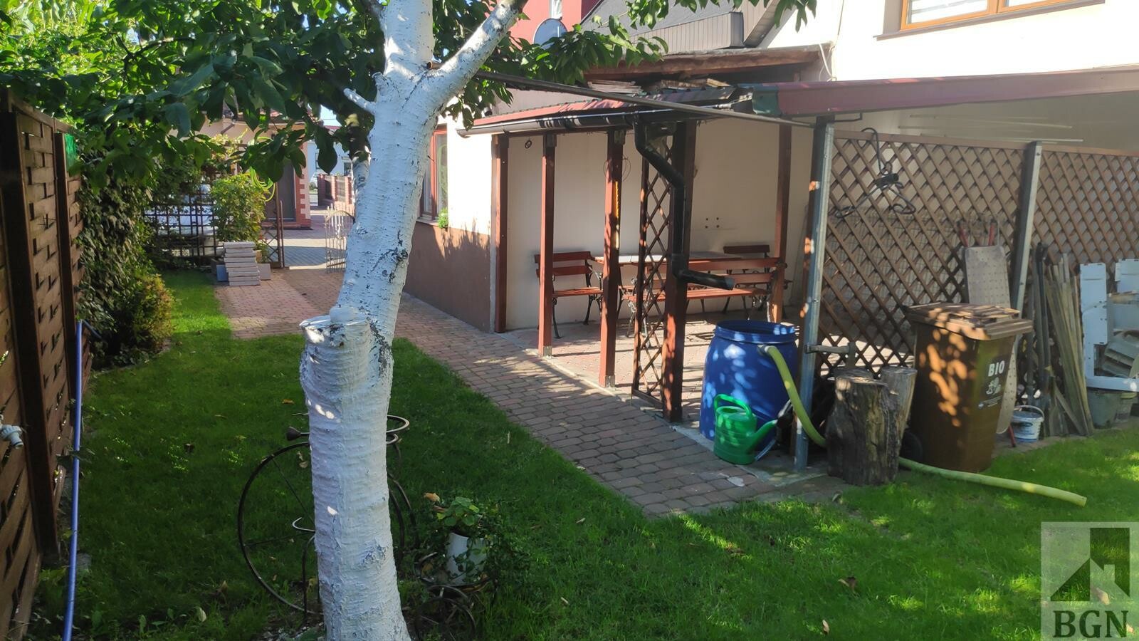 Z tyłu domu ogródek i zadaszone miejsce na grilla.