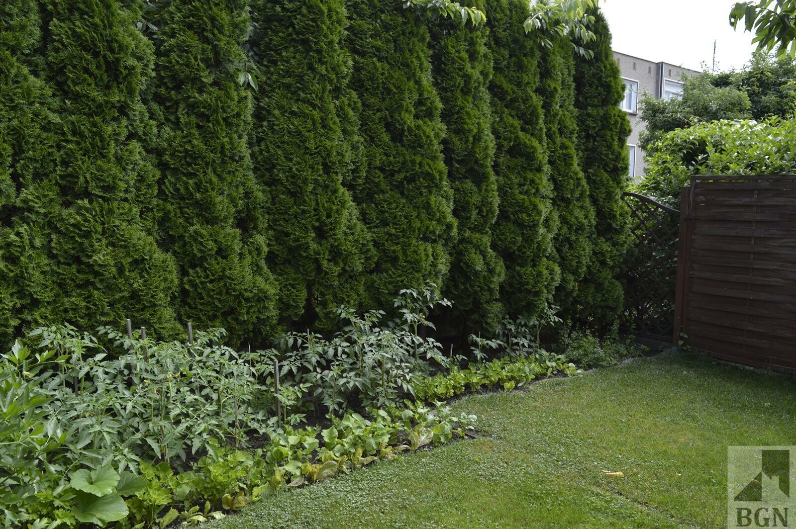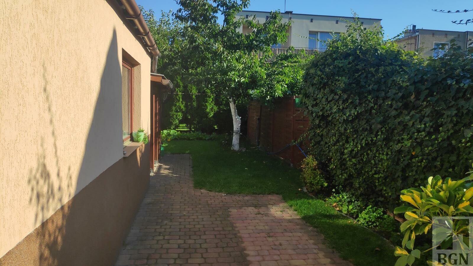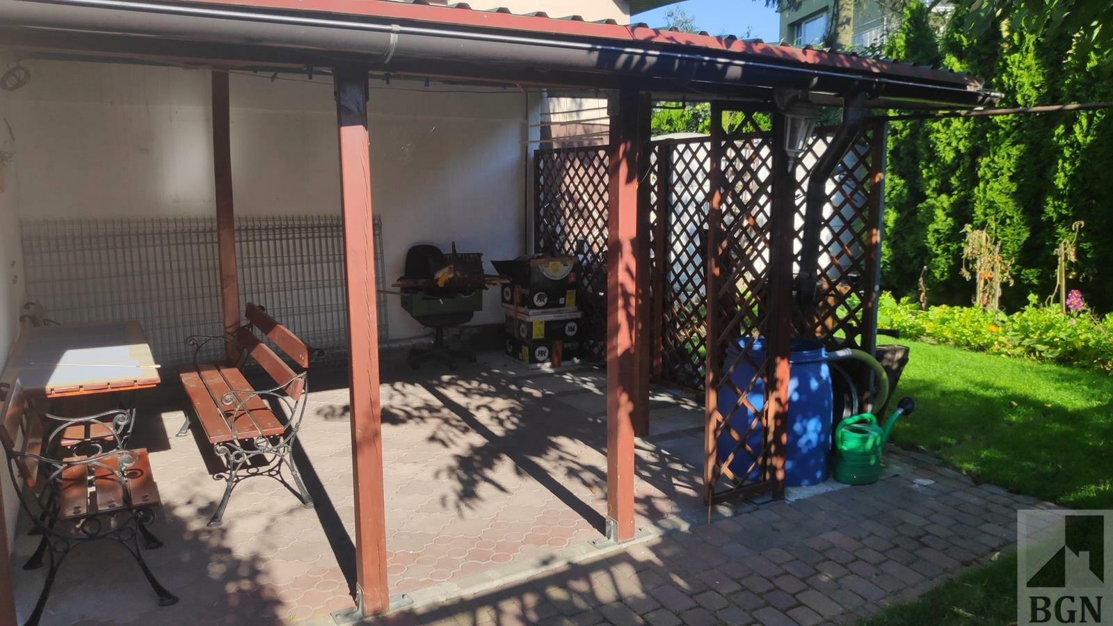 Z tyłu domu ogródek i zadaszone miejsce na grilla.
