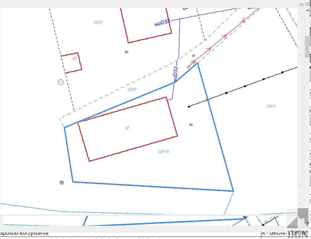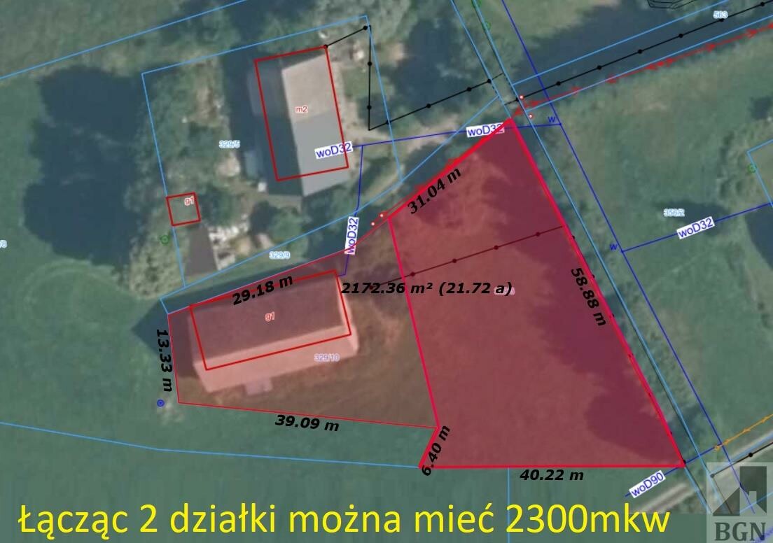 Działka płaska nieogrodzona, w kształcie trapezu (29x13x39x26). zabudowana stodołą o wymiarach 23x11m (253 mkw), dwie kondygnacje, w dobrym stanie.