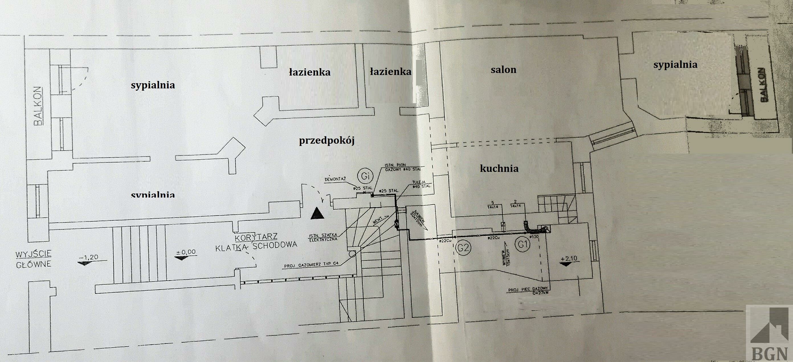 Cztery pokoje (trzy sypialnie), kuchnia z oknem otwarta na salon, dwie łazienki, przedpokój, mieszkanie dwustronne, z niewielkim balkonem. Wysoki parter, mieszkanie o wysokości 4,00 m, doskonałe do prowadzenia biura, kancelarii, działalności gospodarczej lub też zamieszkania.